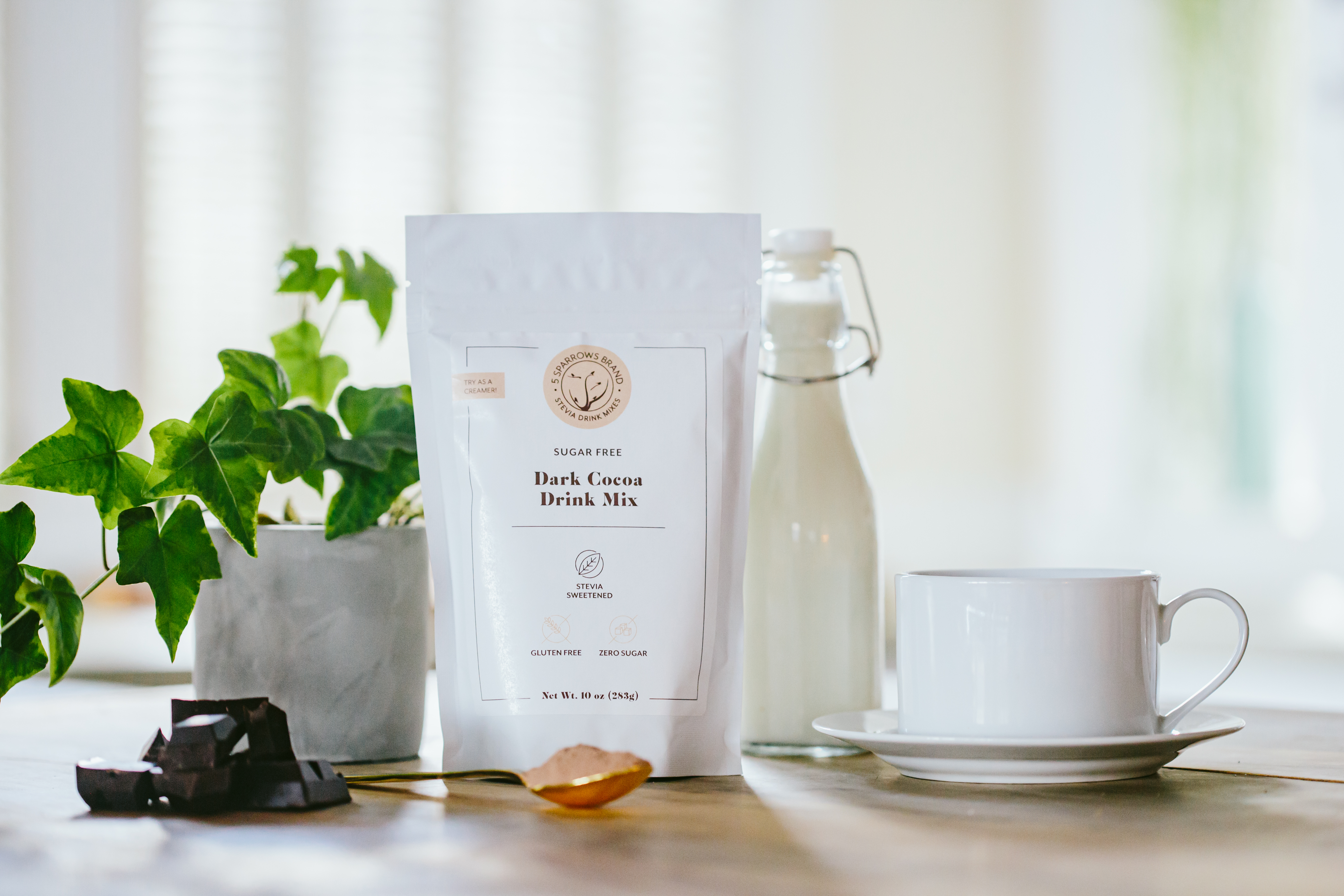 - Add 2 tablespoons of 5 Sparrows sugar-free chocolate powder.
