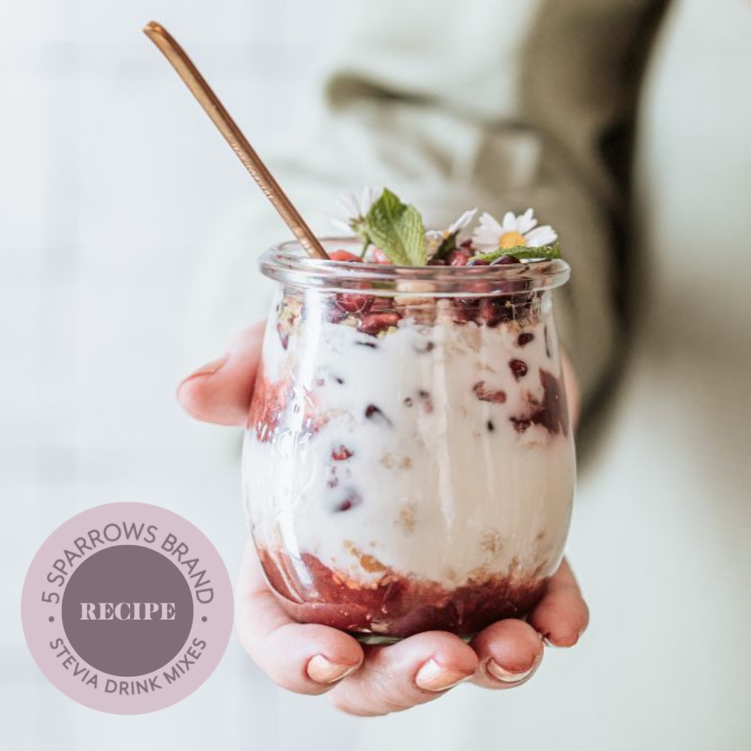 - In a parfait cup, layer the berries with our Sugar-Free Whipped Cream made with 5 Sparrows Sugar-Free White Chocolate Mix.