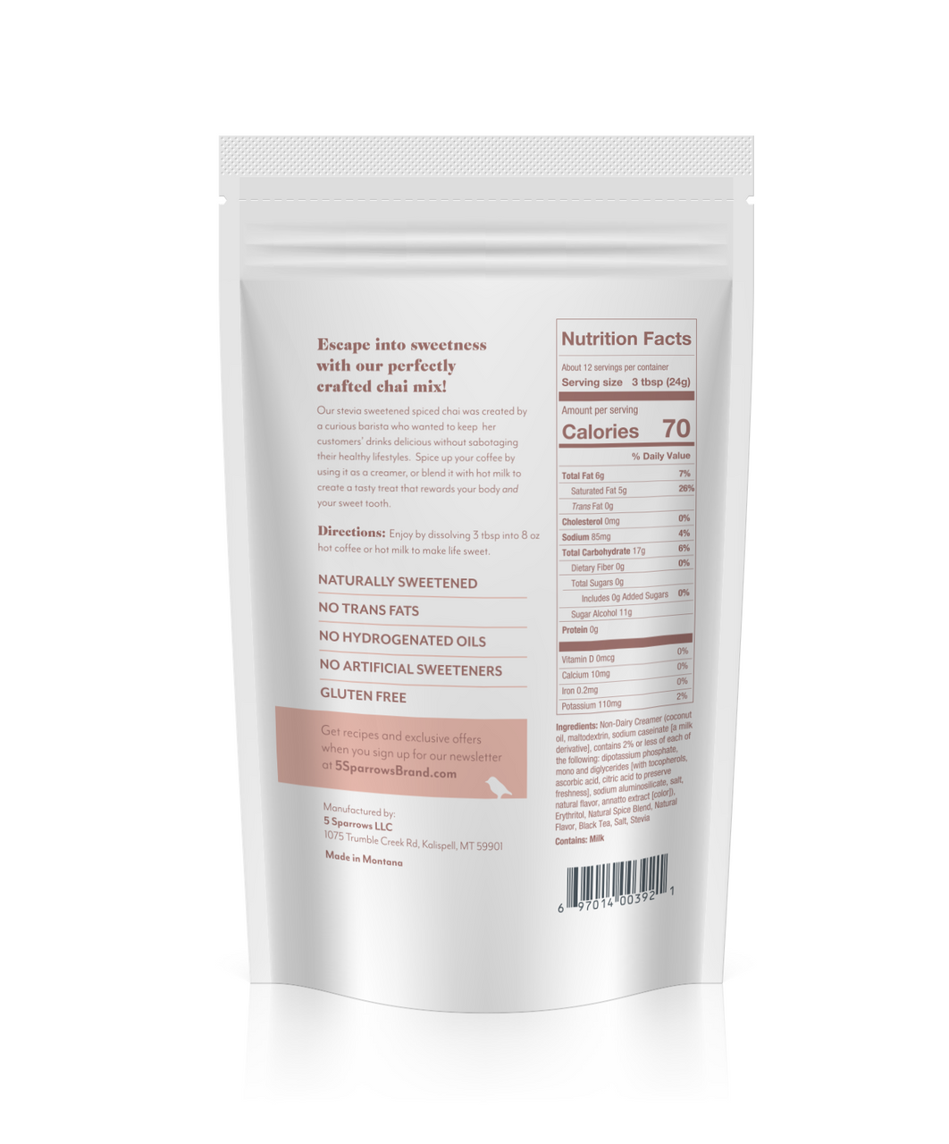 On the hunt for a guilt free treat? Our sugar free chai tea latte has got you covered! Sweet and mildly spicy, it’s naturally sweetened and is 100% sugar free. You’ll love it mixed with coffee to enjoy as a “Dirty Chai Tea Latte.” Alternately, mix it in with your favorite hot milk or milk alternative for a warm, creamy, treat that will satisfy your cravings without sacrificing your health goals.